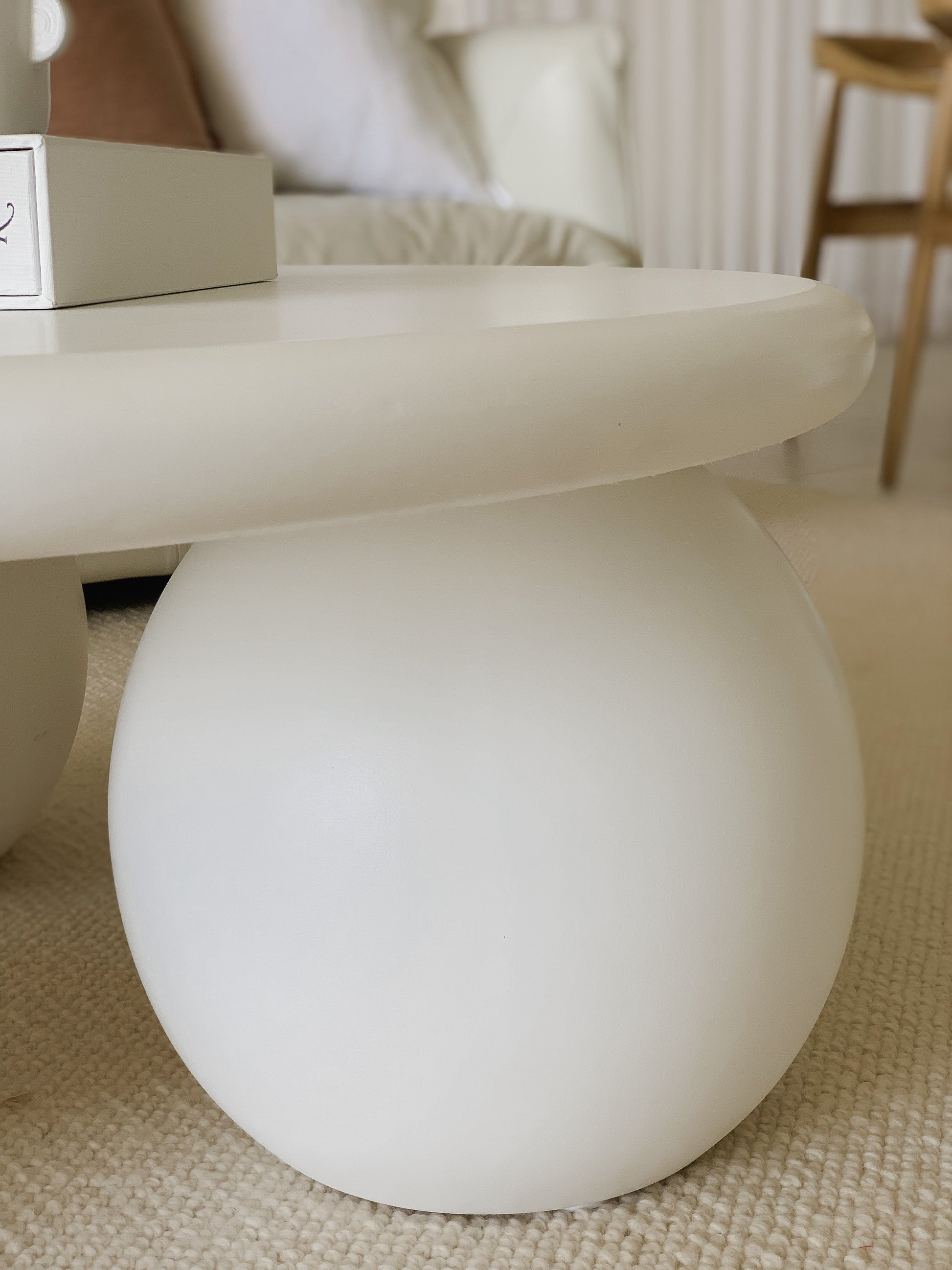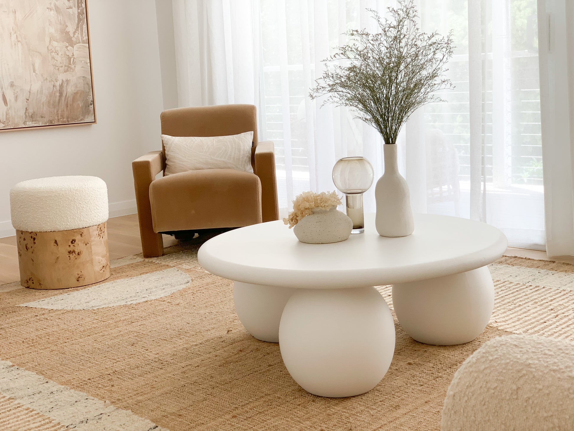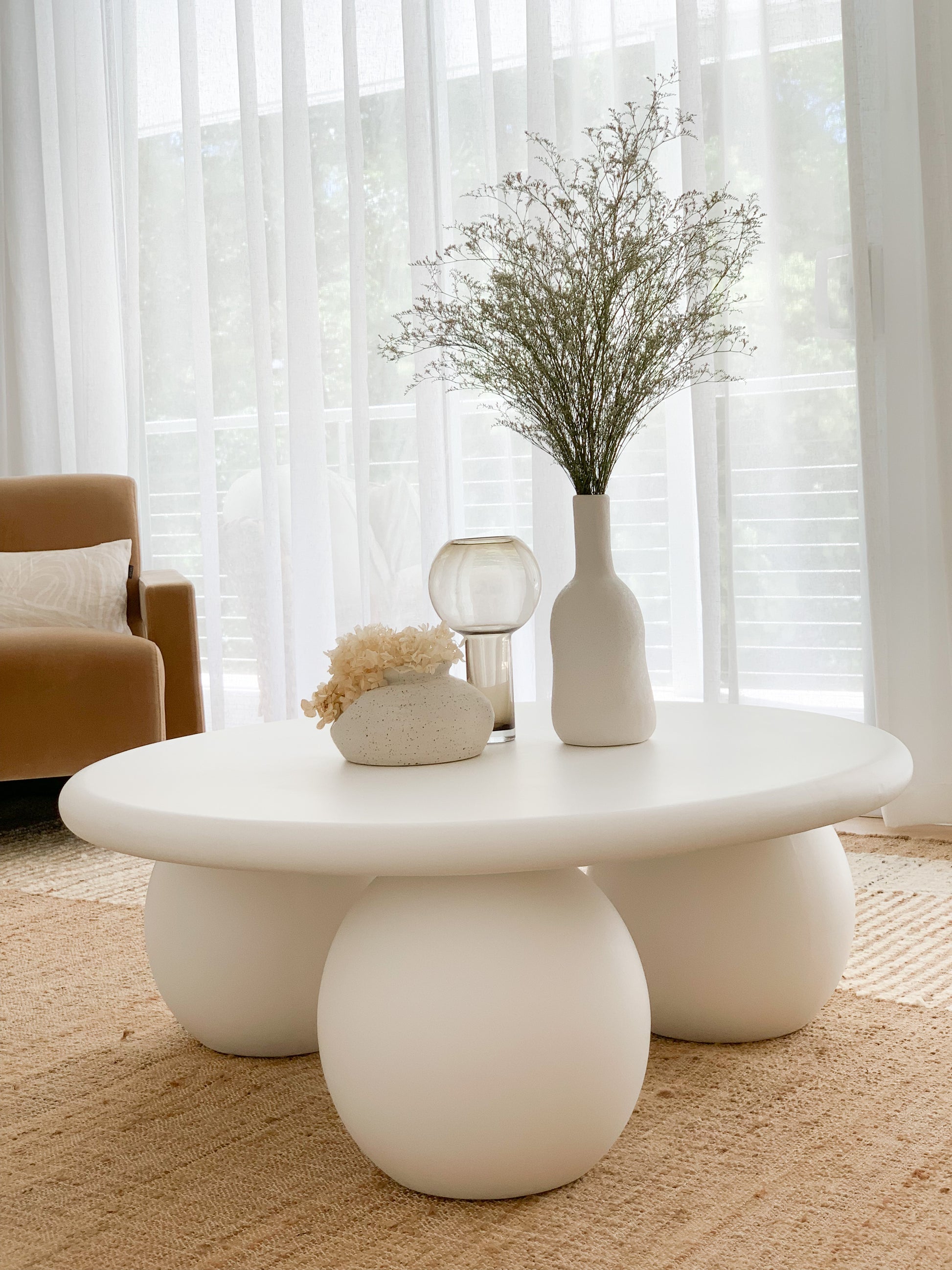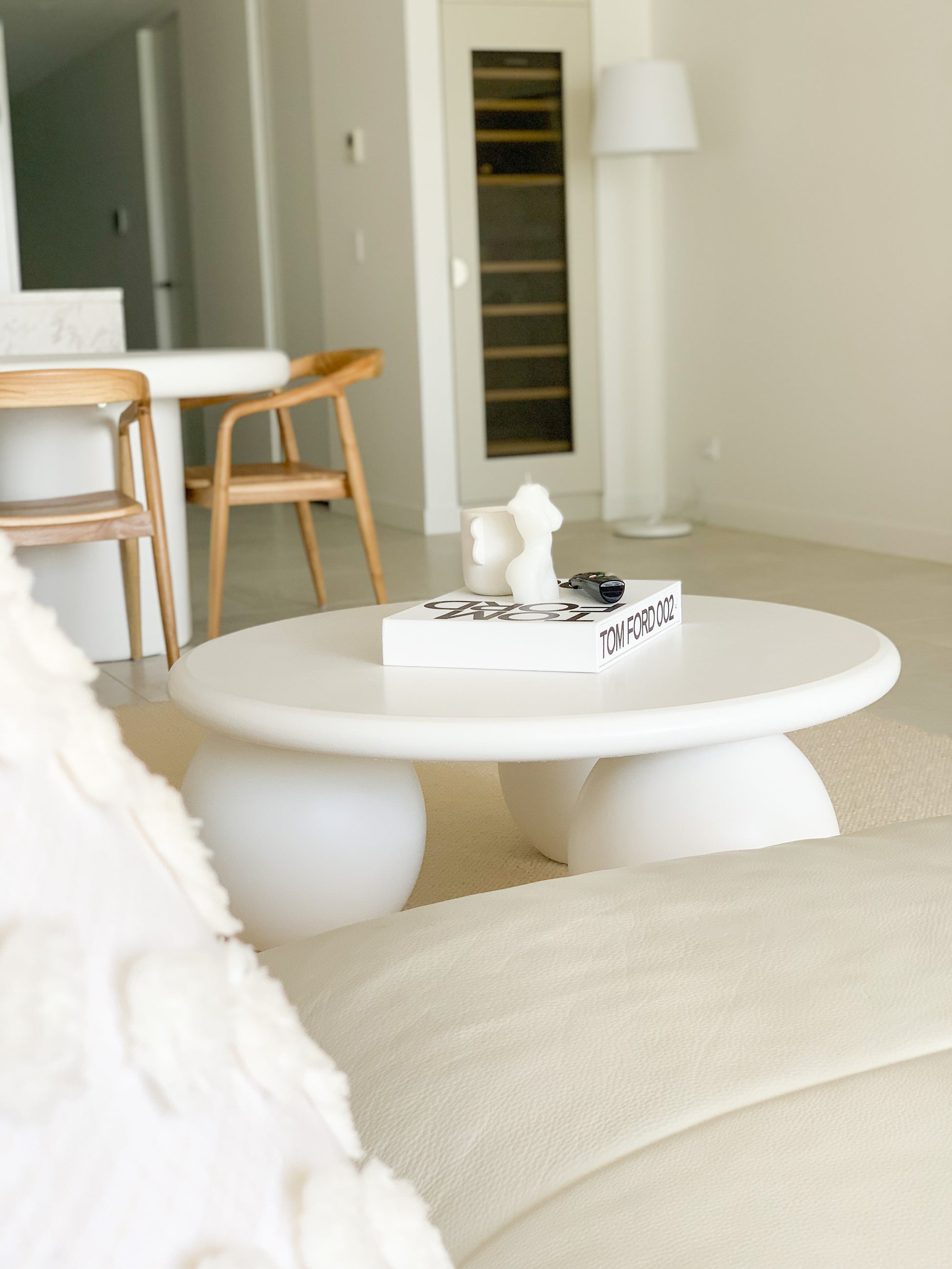 Introducing the Priscilla-Curve Coffee Table — a statement of minimalistic luxury. Exclusively designed by P&R Styling, this masterpiece is crafted from pure white concrete and features three soft, curved spheres aligned perfectly with a round surface to create a bold yet soft design. Its unique form makes it a standout piece in any modern living space, effortlessly blending artistry with function.