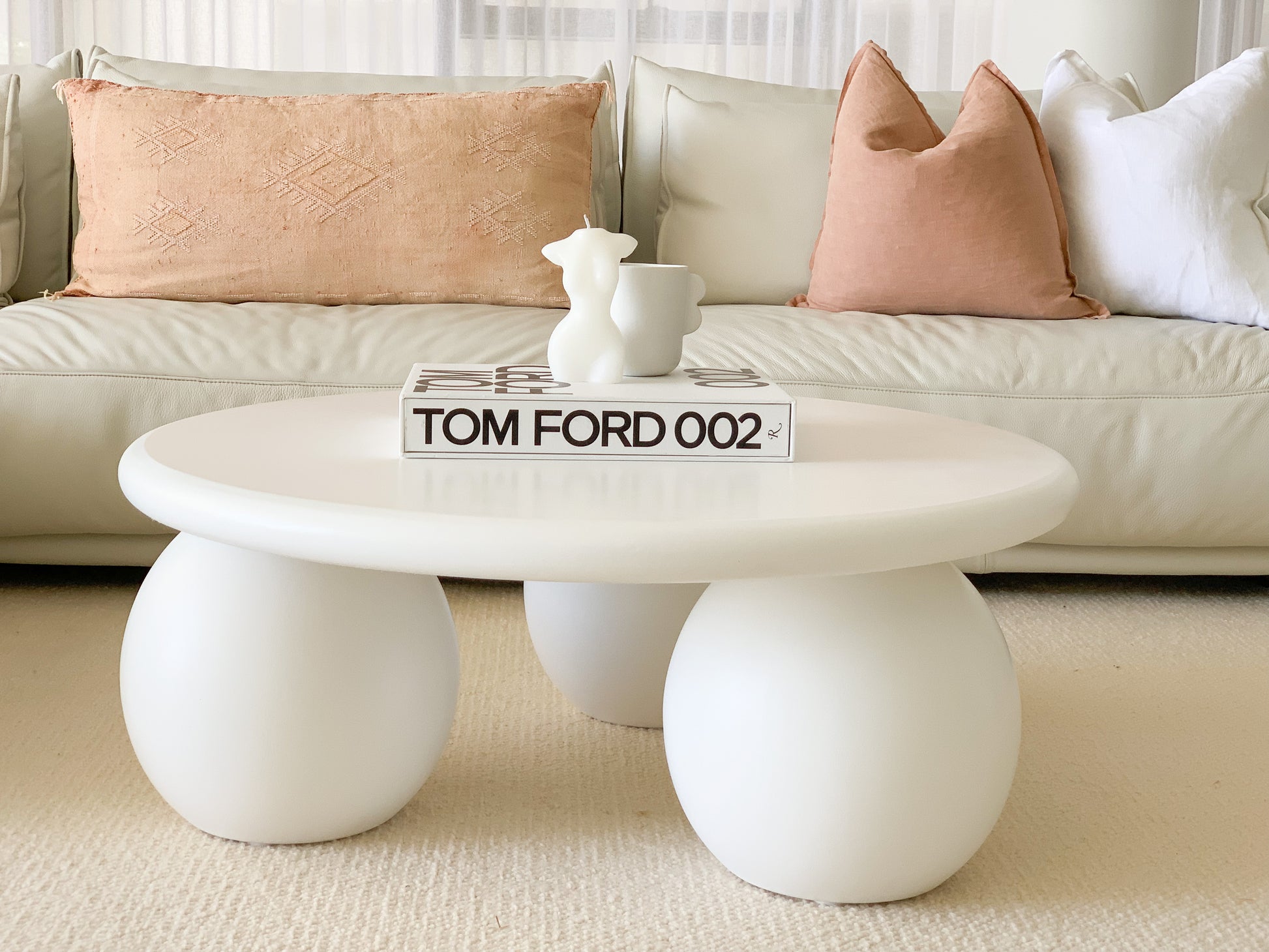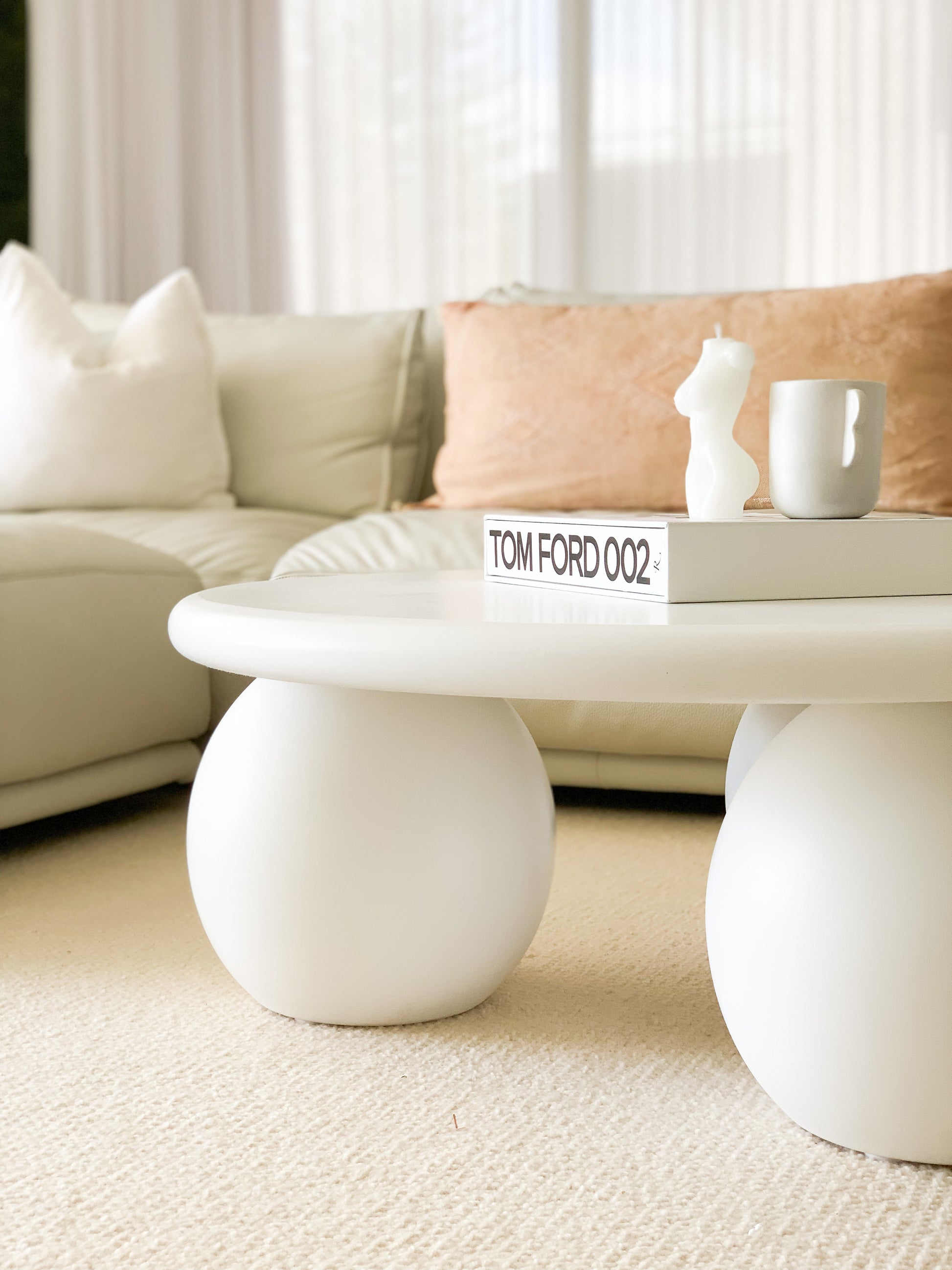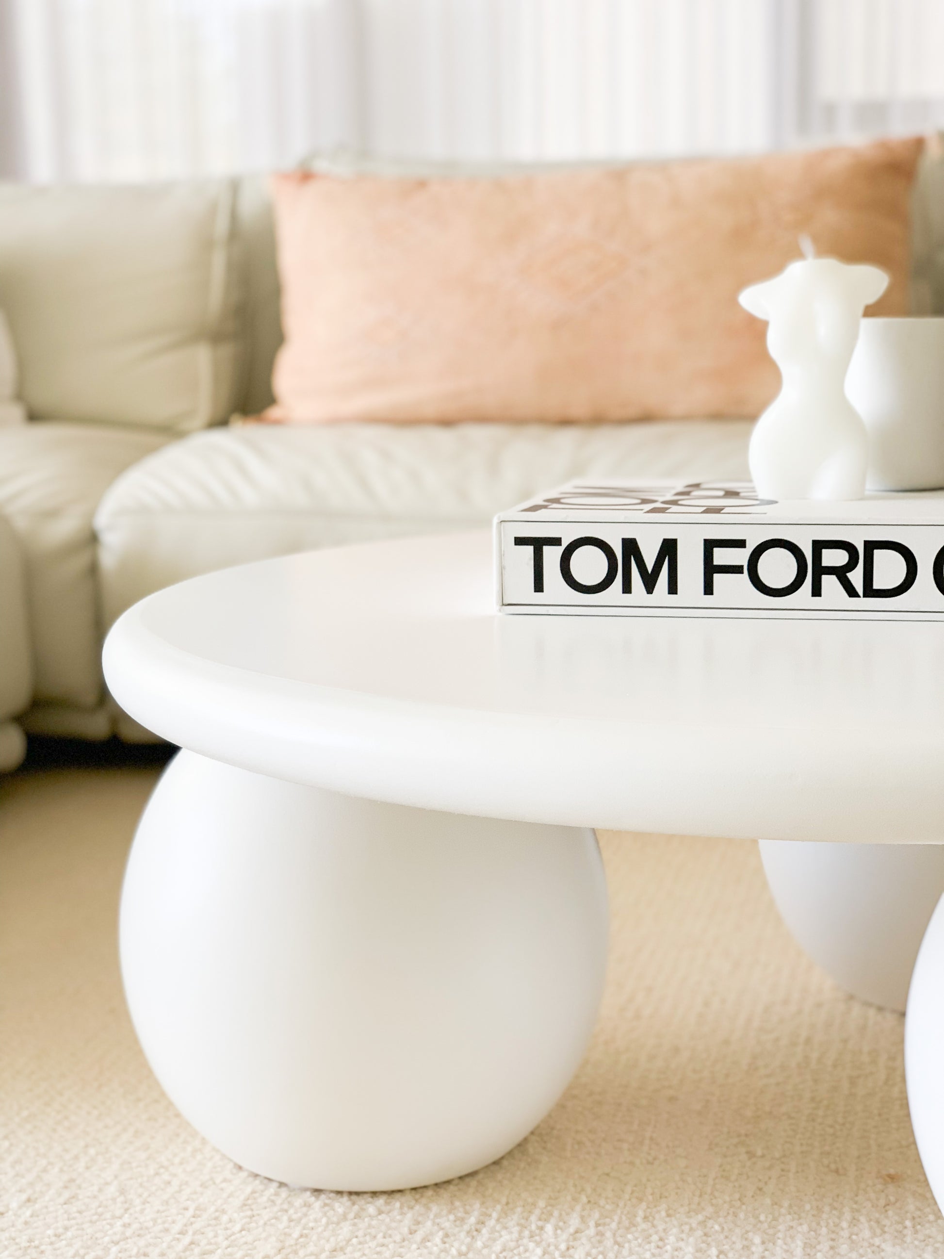 Introducing the Priscilla-Curve Coffee Table — a statement of minimalistic luxury. Exclusively designed by P&R Styling, this masterpiece is crafted from pure white concrete and features three soft, curved spheres aligned perfectly with a round surface to create a bold yet soft design. Its unique form makes it a standout piece in any modern living space, effortlessly blending artistry with function.