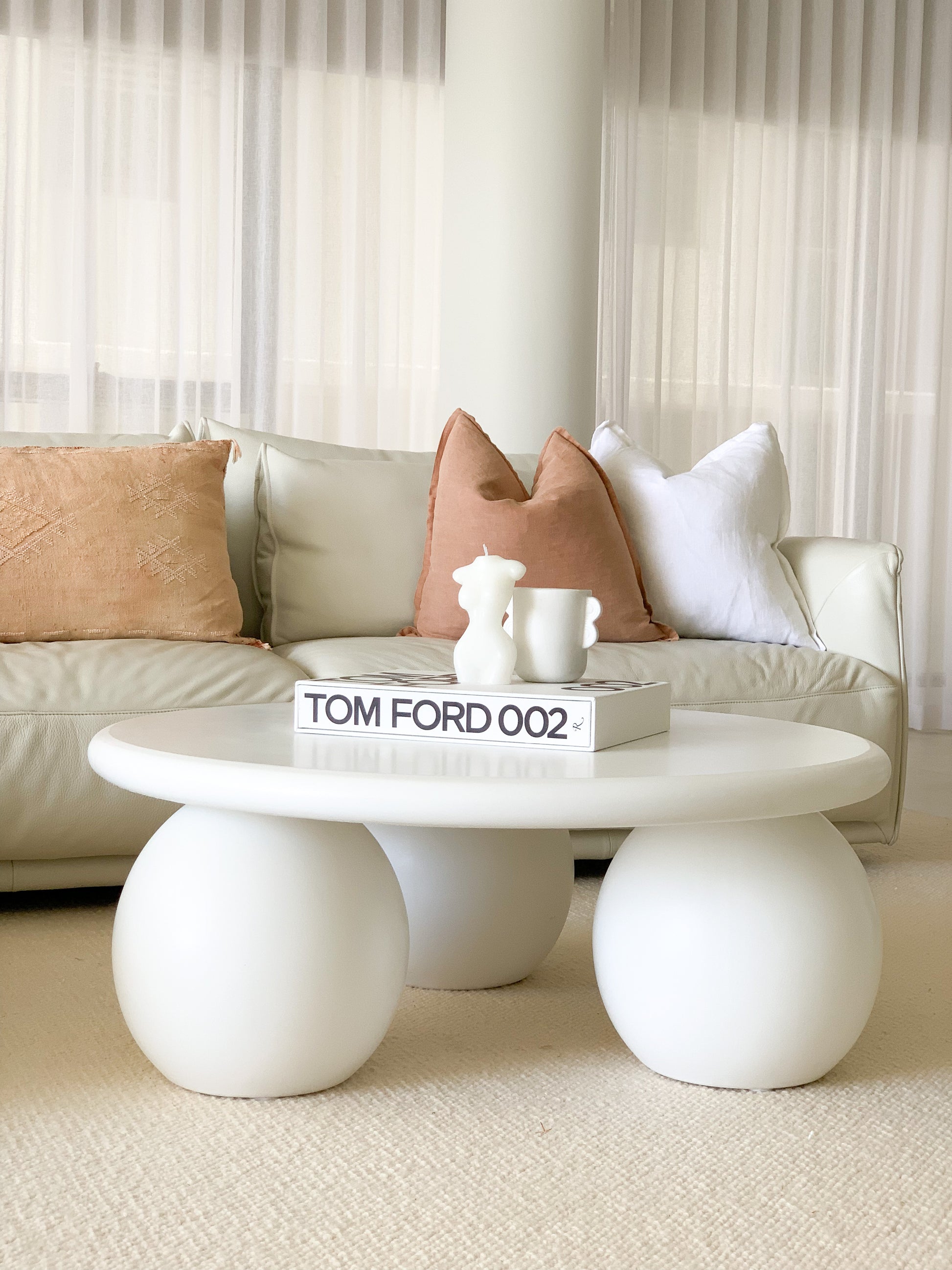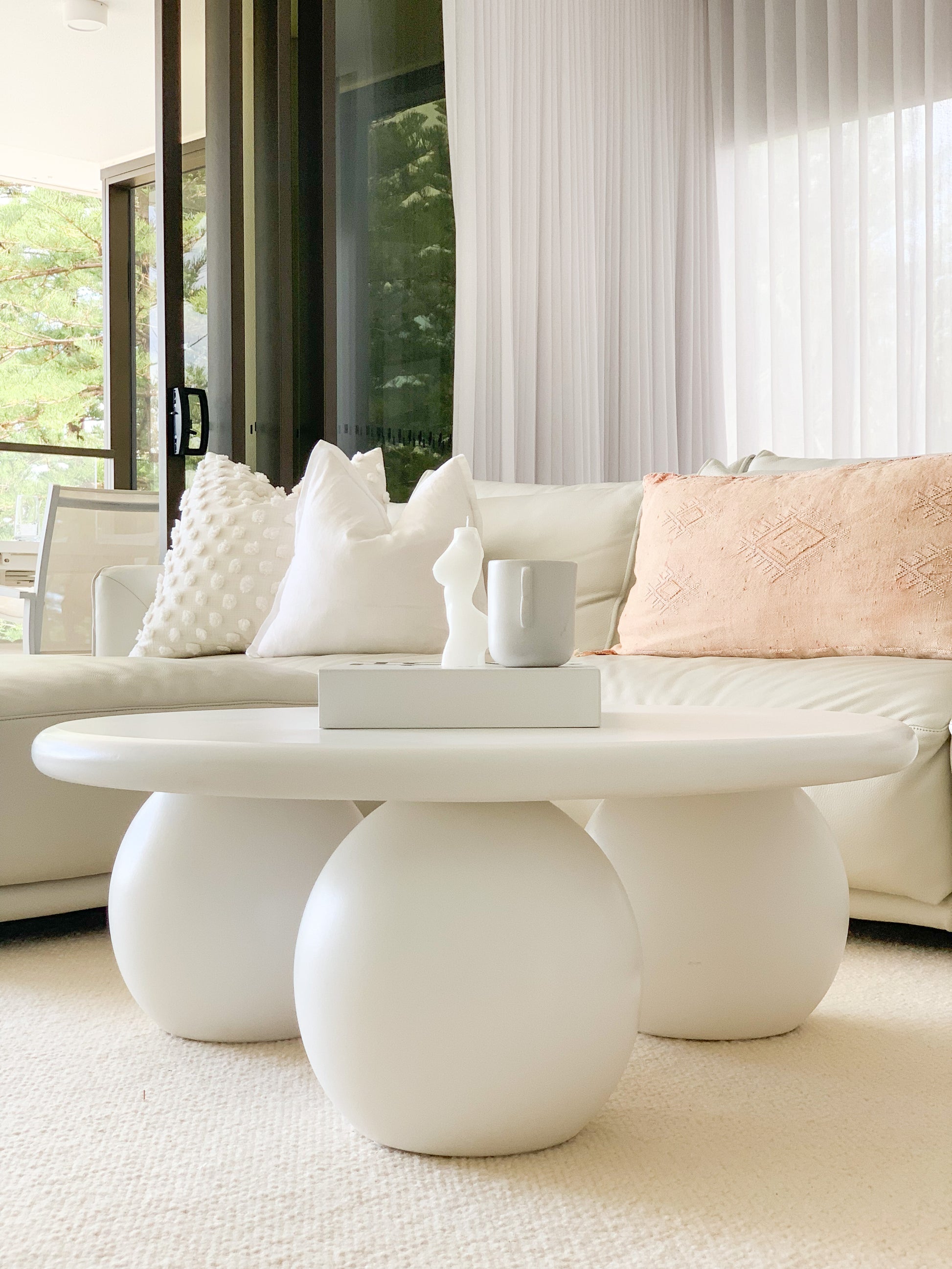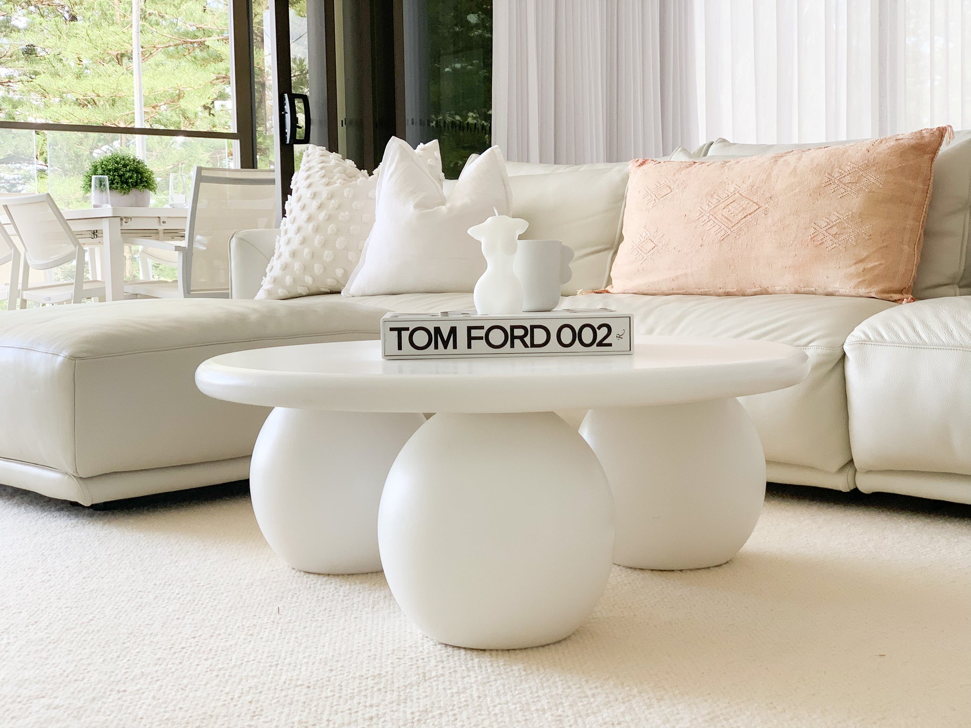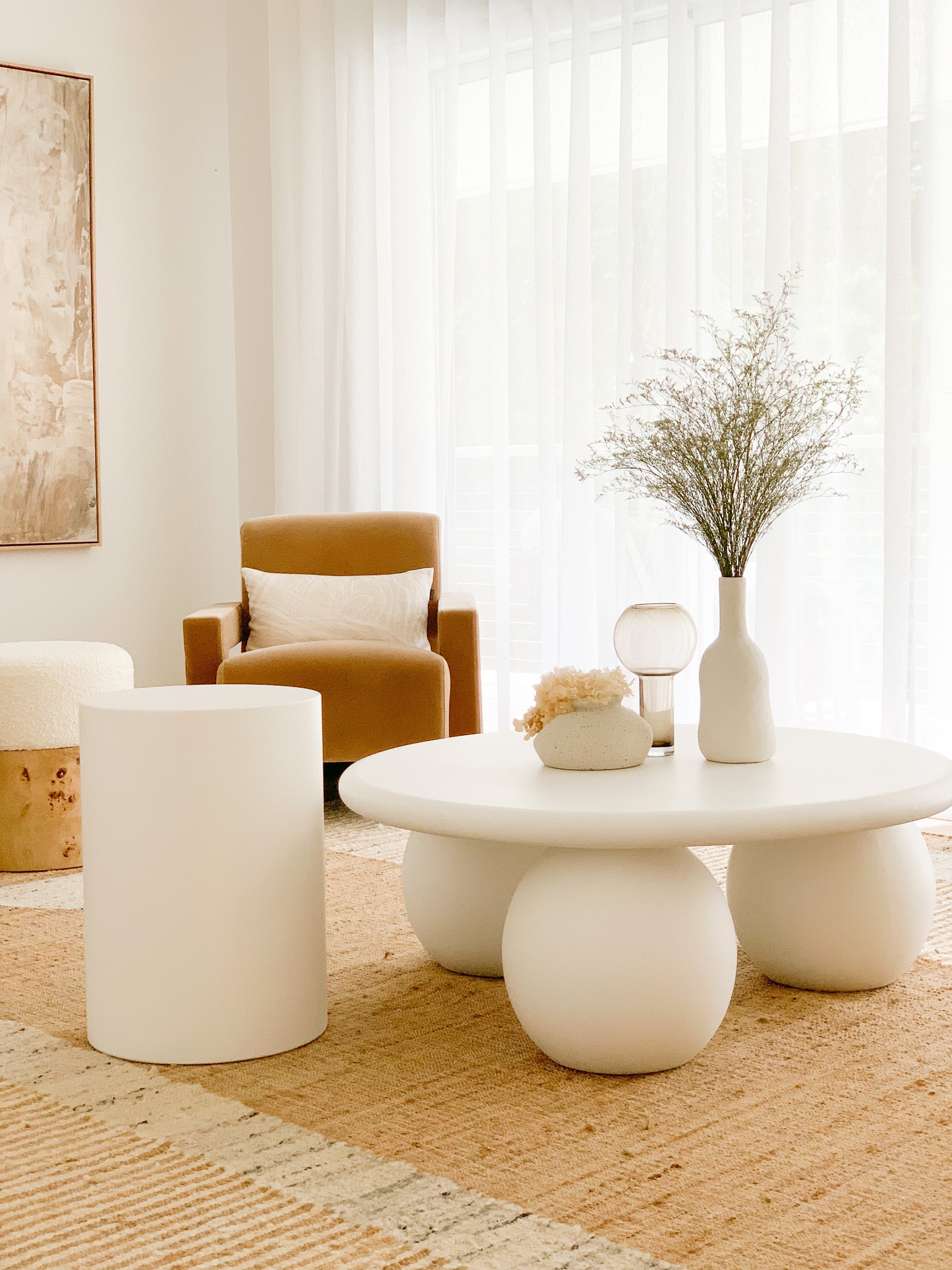 Introducing the Priscilla-Curve Coffee Table — a statement of minimalistic luxury. Exclusively designed by P&R Styling, this masterpiece is crafted from pure white concrete and features three soft, curved spheres aligned perfectly with a round surface to create a bold yet soft design. Its unique form makes it a standout piece in any modern living space, effortlessly blending artistry with function.
