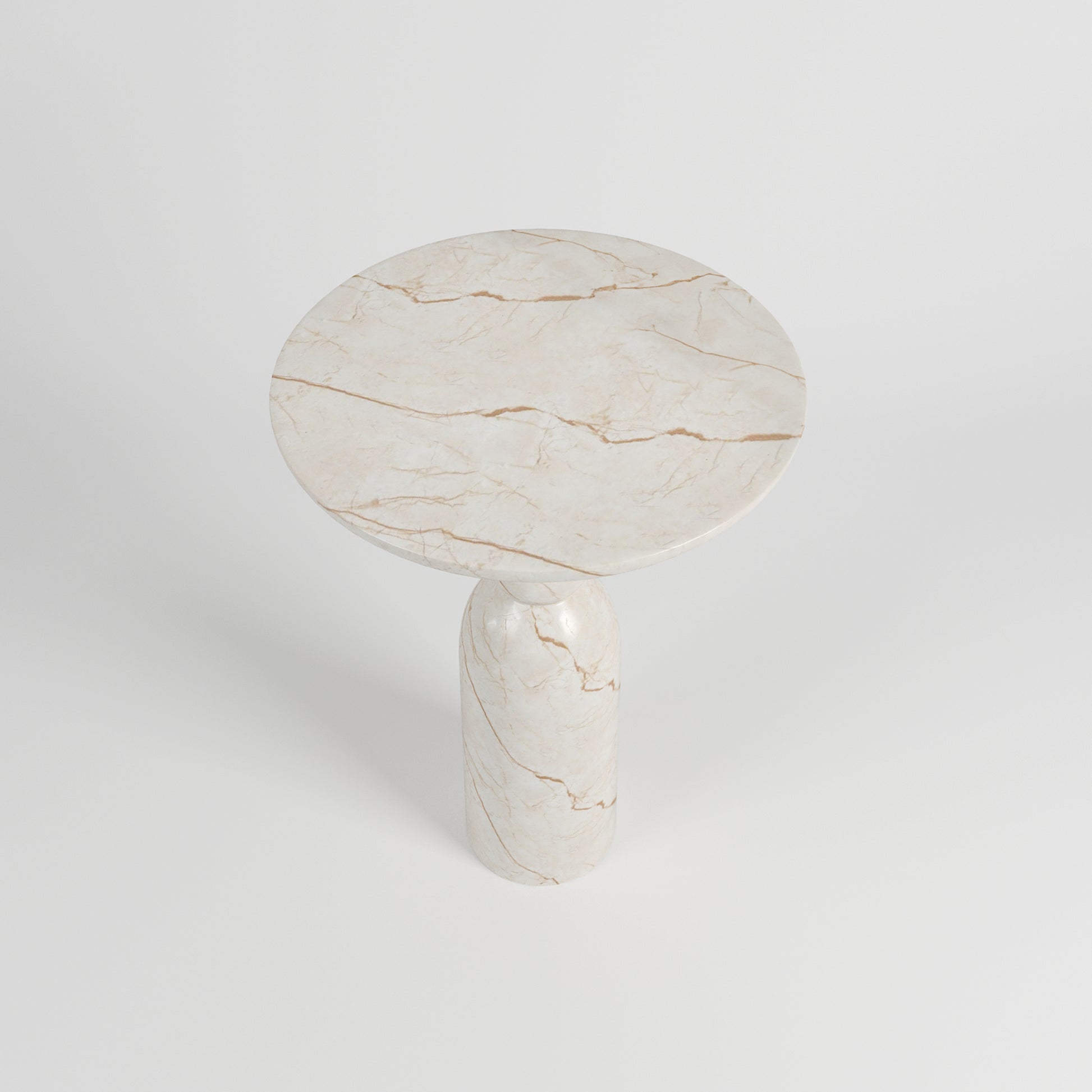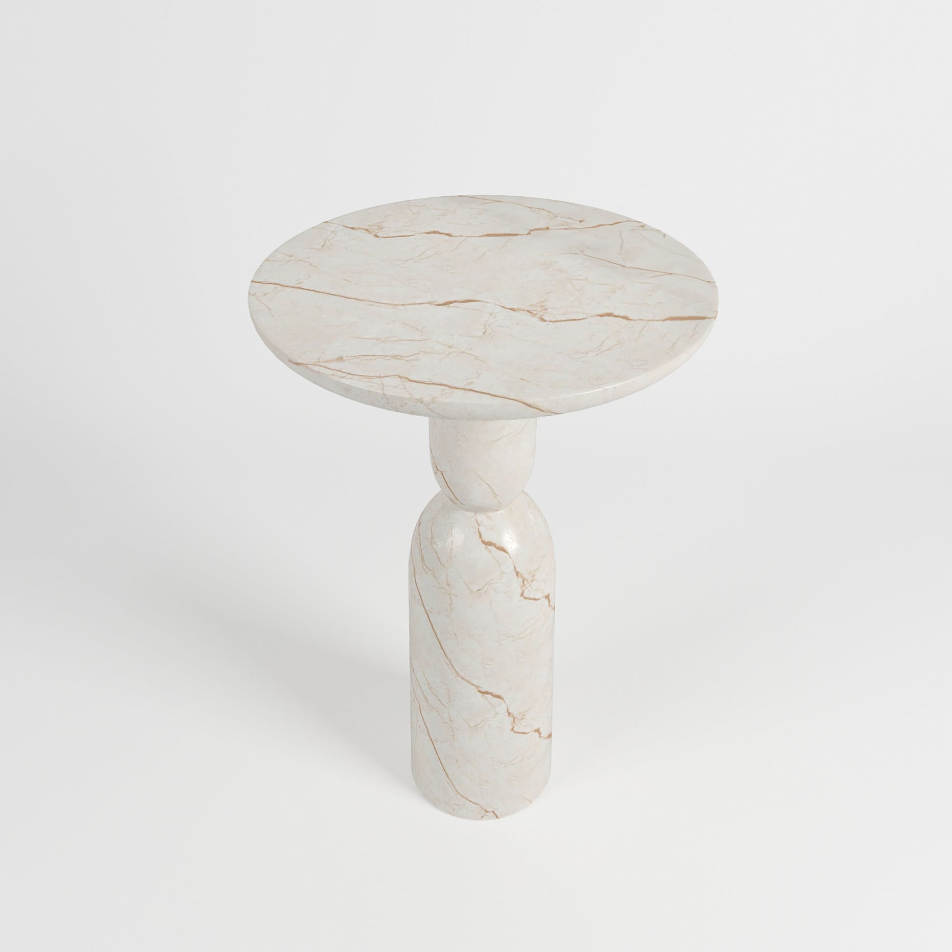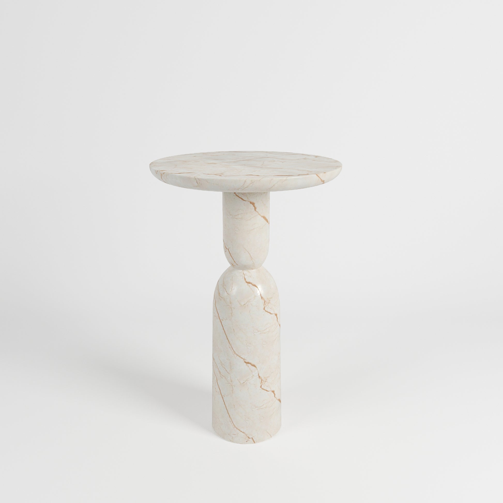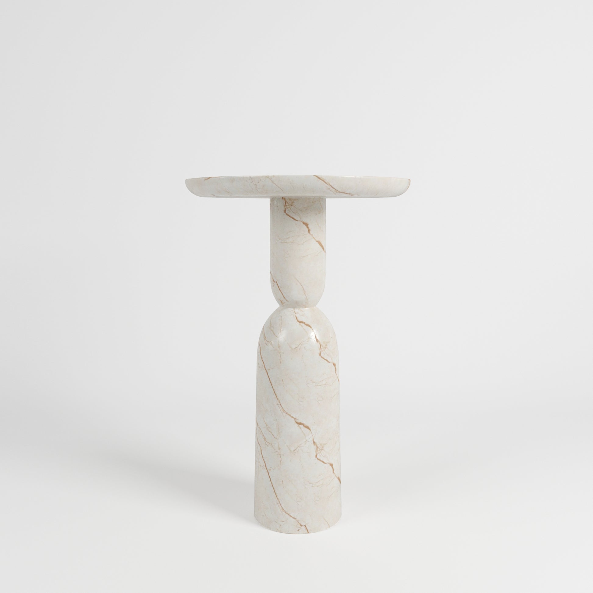 The Bhone Dry Bar Table brings gentle sophistication to both indoor and outdoor entertaining spaces. Crafted with a solid concrete core and finished in our Royal Vanilla Marble, it showcases warm cream tones and delicate veining that give the piece a naturally refined presence. Its tall, sculptural base curves gracefully into a round tabletop, creating a silhouette that feels contemporary yet timeless.