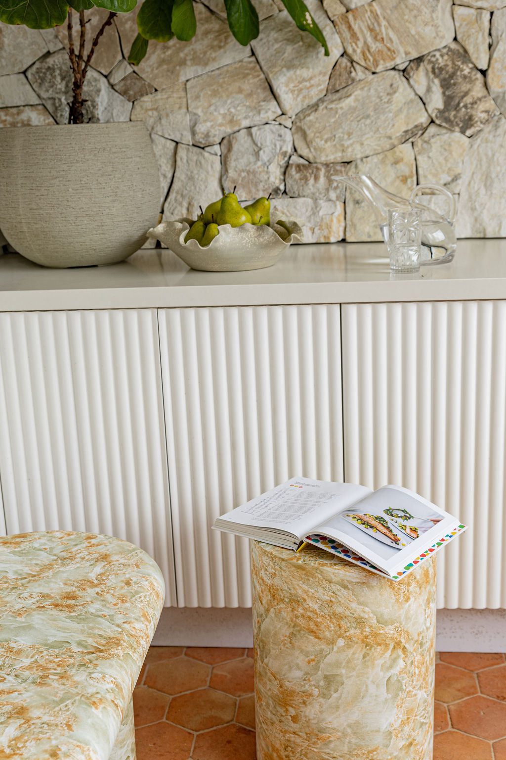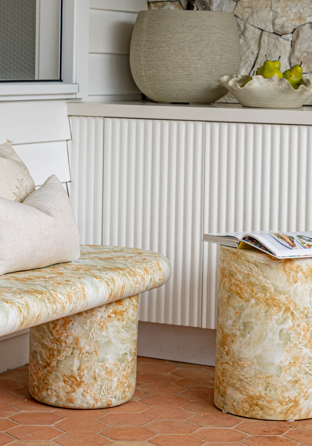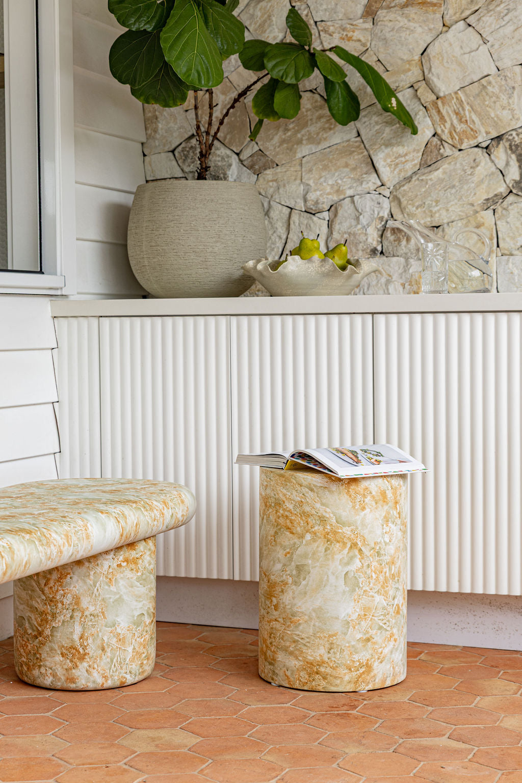 Its minimalist silhouette and generous proportions bring a gentle presence to your dining area, designed to sit beautifully in both indoor settings and covered outdoor spaces. Each piece features its own unique stone patterning, giving it an understated individuality.