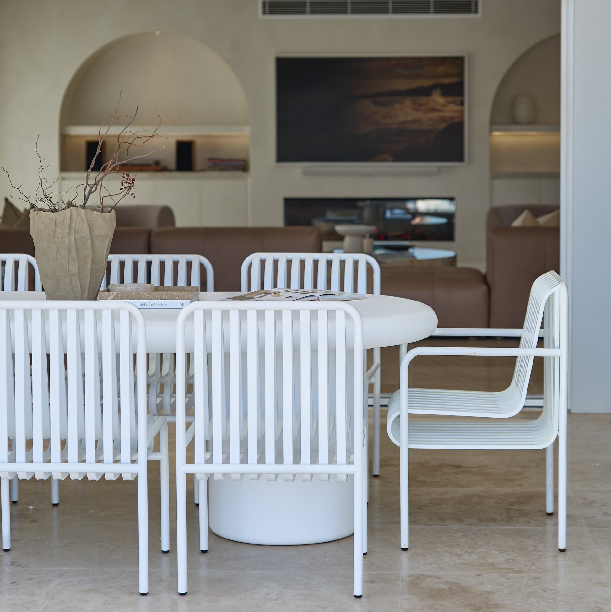 Effortlessly modern with subtle curves and sleek lines, the Aurora Dining Chair brings a fresh, cool edge to outdoor and indoor dining spaces. Designed by P&R Styling, this armless chair is crafted from powder-coated metal, combining strength, style, and durability in one piece.