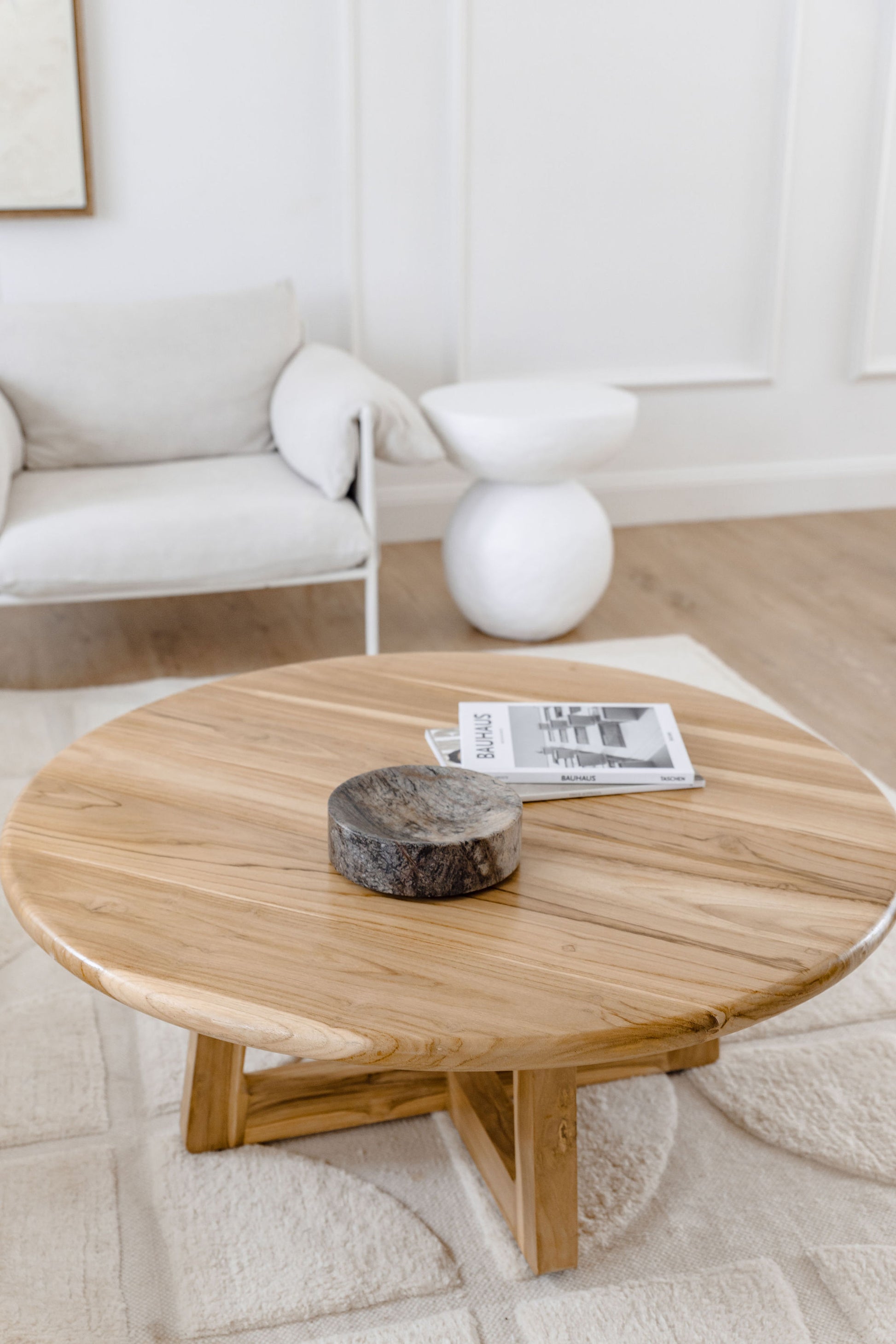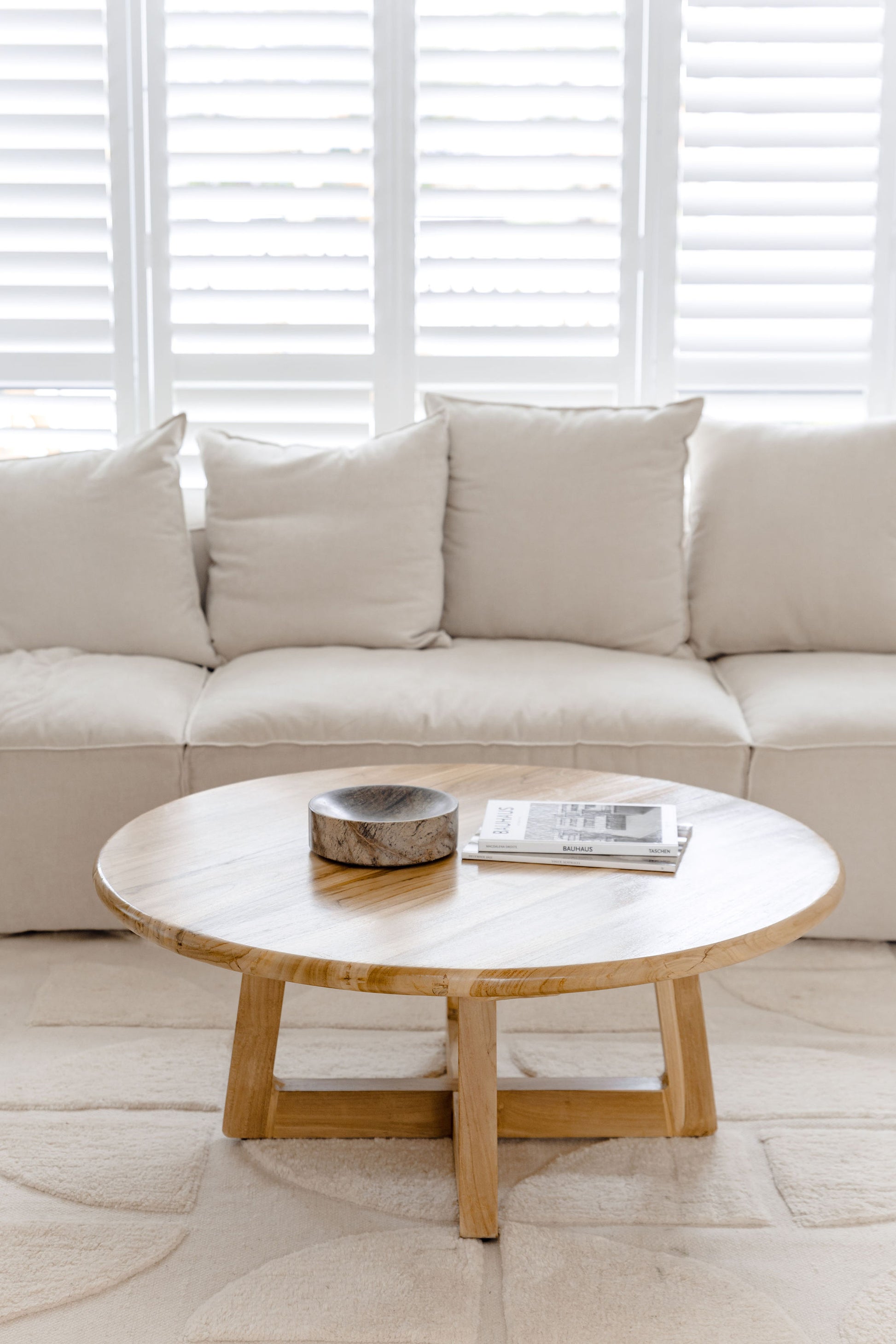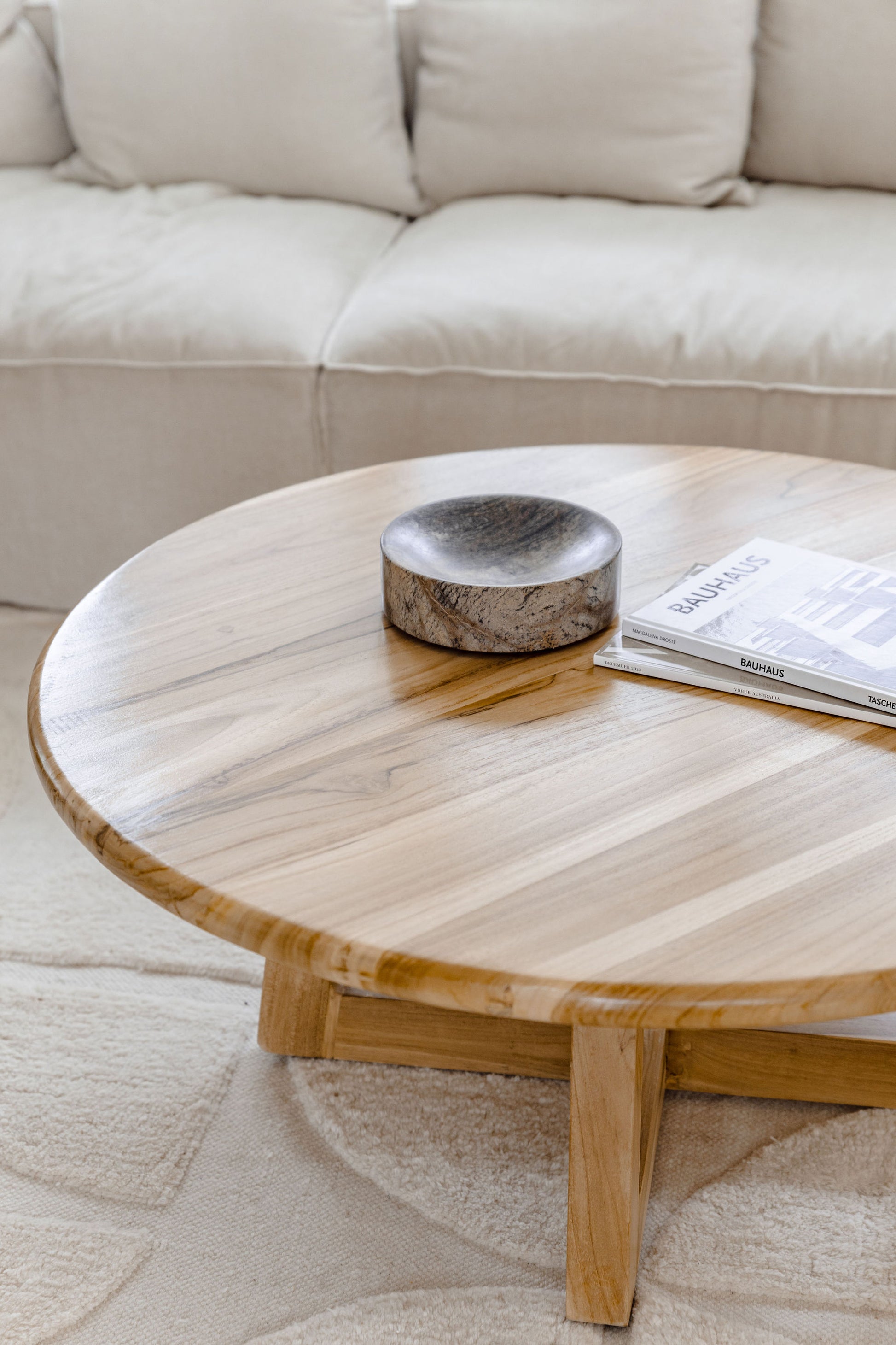 The Ownley Round Coffee Table is a timeless piece that celebrates the natural beauty of solid teak wood. Handcrafted from a single slab, the round tabletop offers organic nature and warmth, highlighting the unique grain and character of each piece.