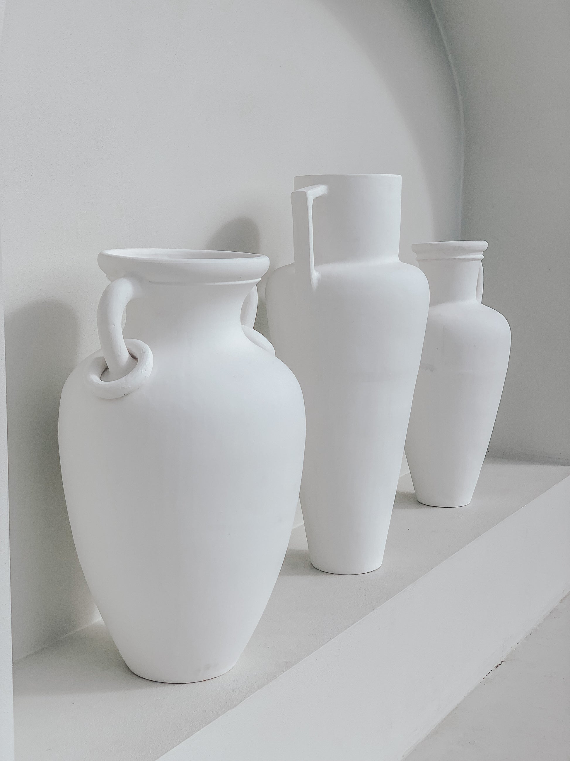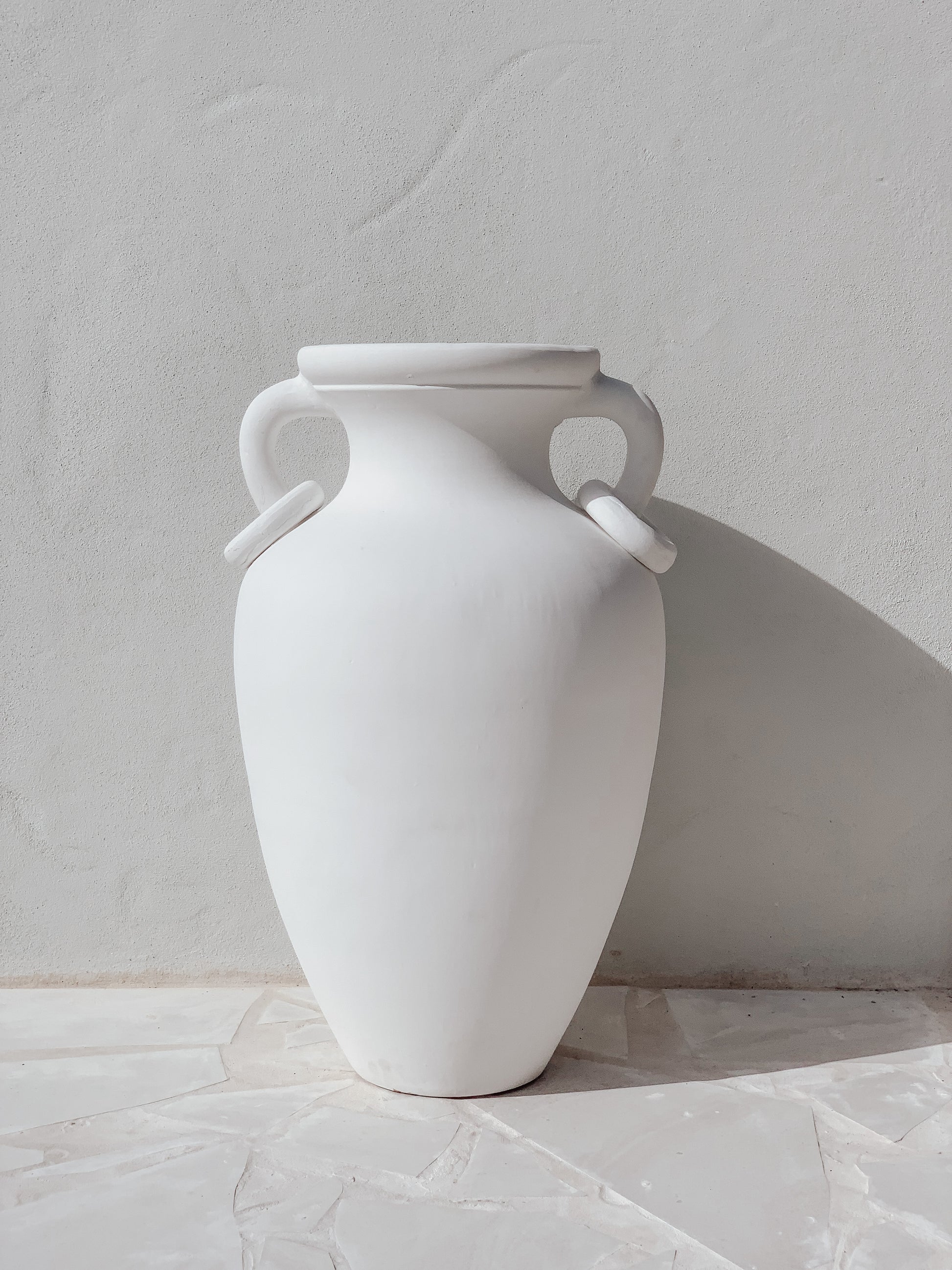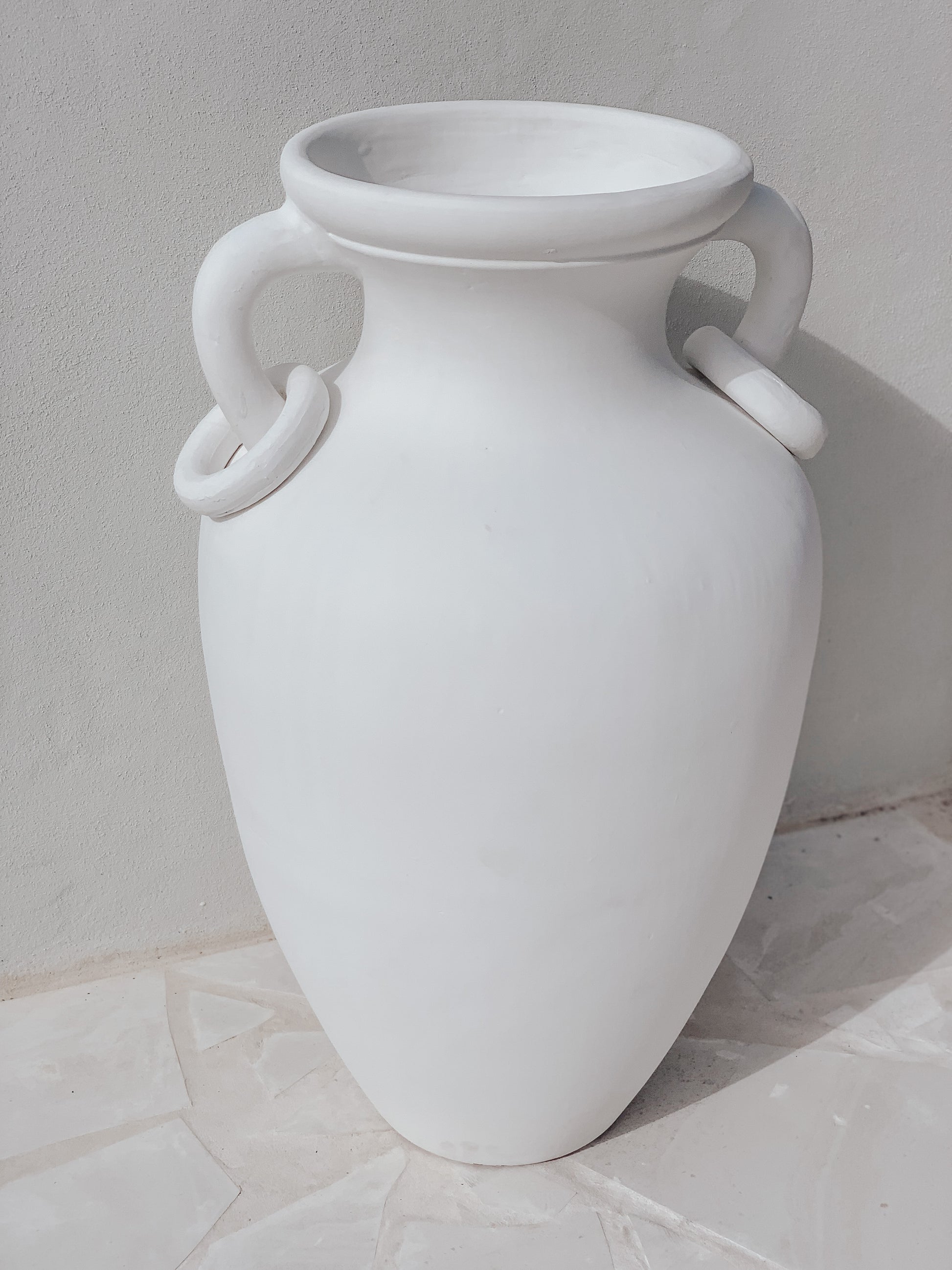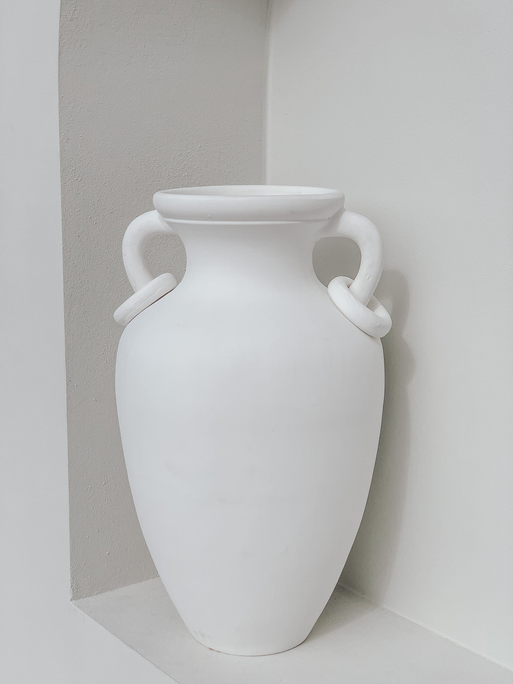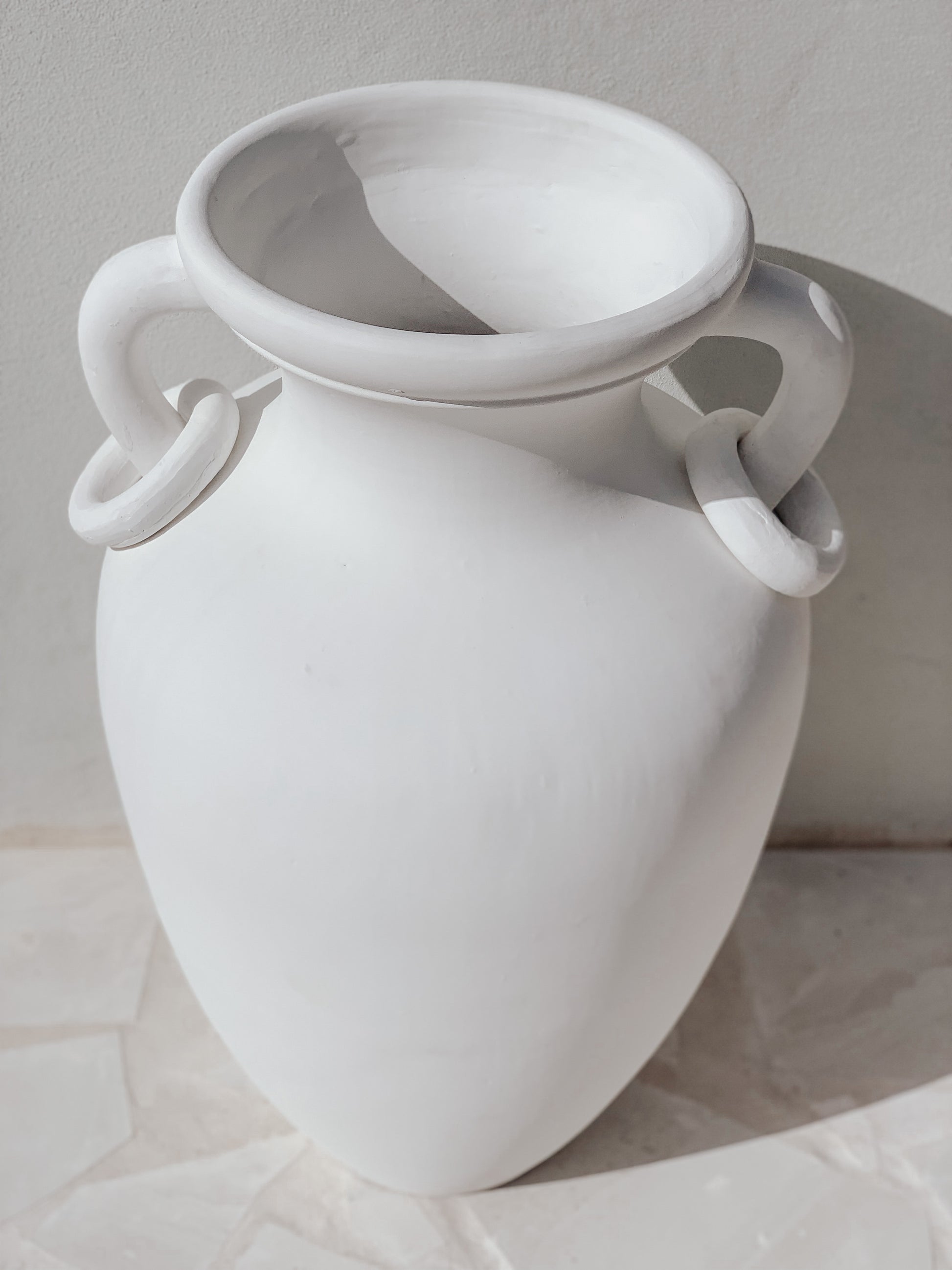 Handcrafted in Vietnam from local clay, the Freya vase features a slim neck that opens into a wide top, curving into a rounded body and tapering to a flat base. Two elegant curved handles, each with a ring, complete the striking design. Finished in a smooth matte white, this vase is both functional and decorative.