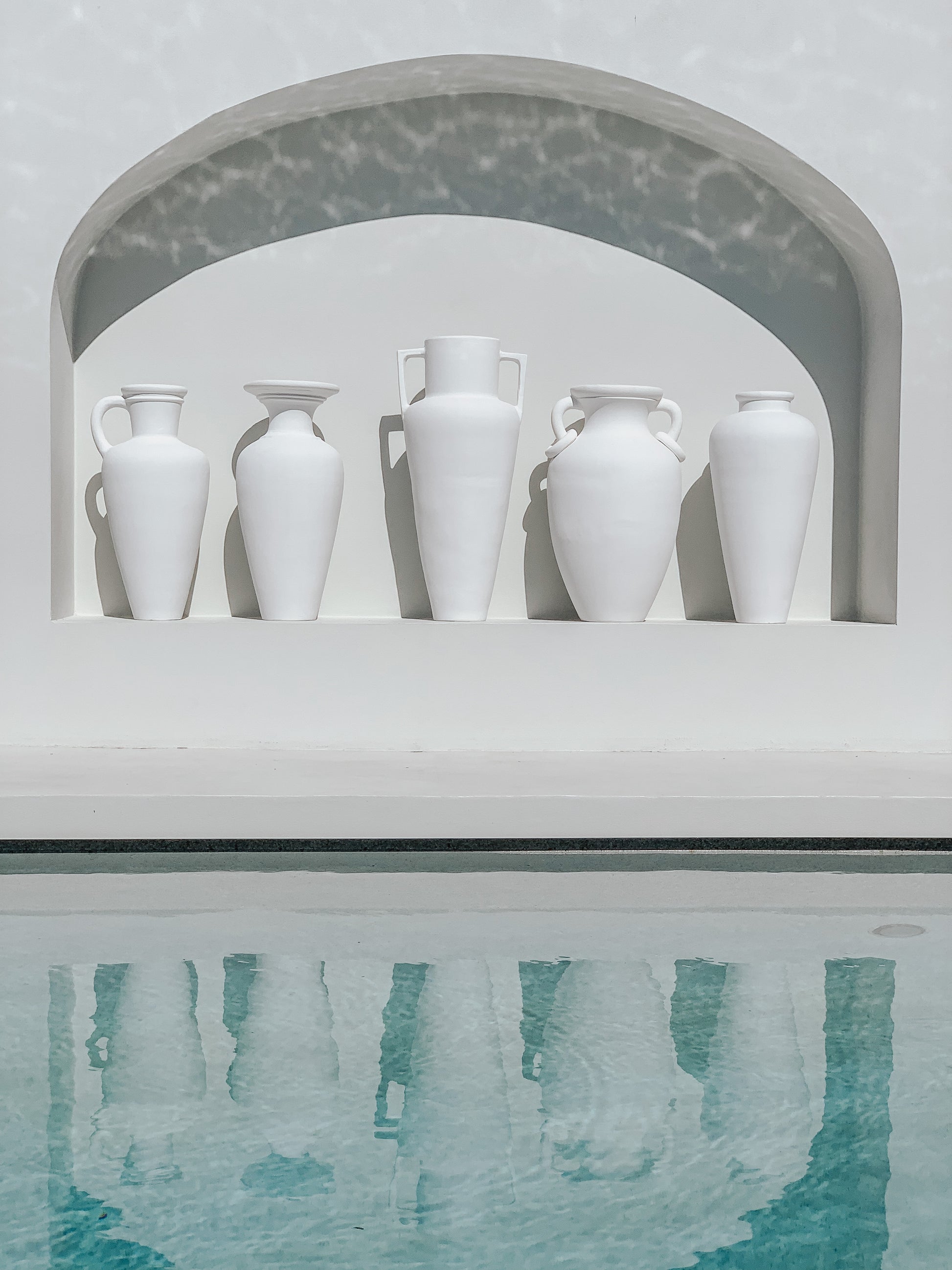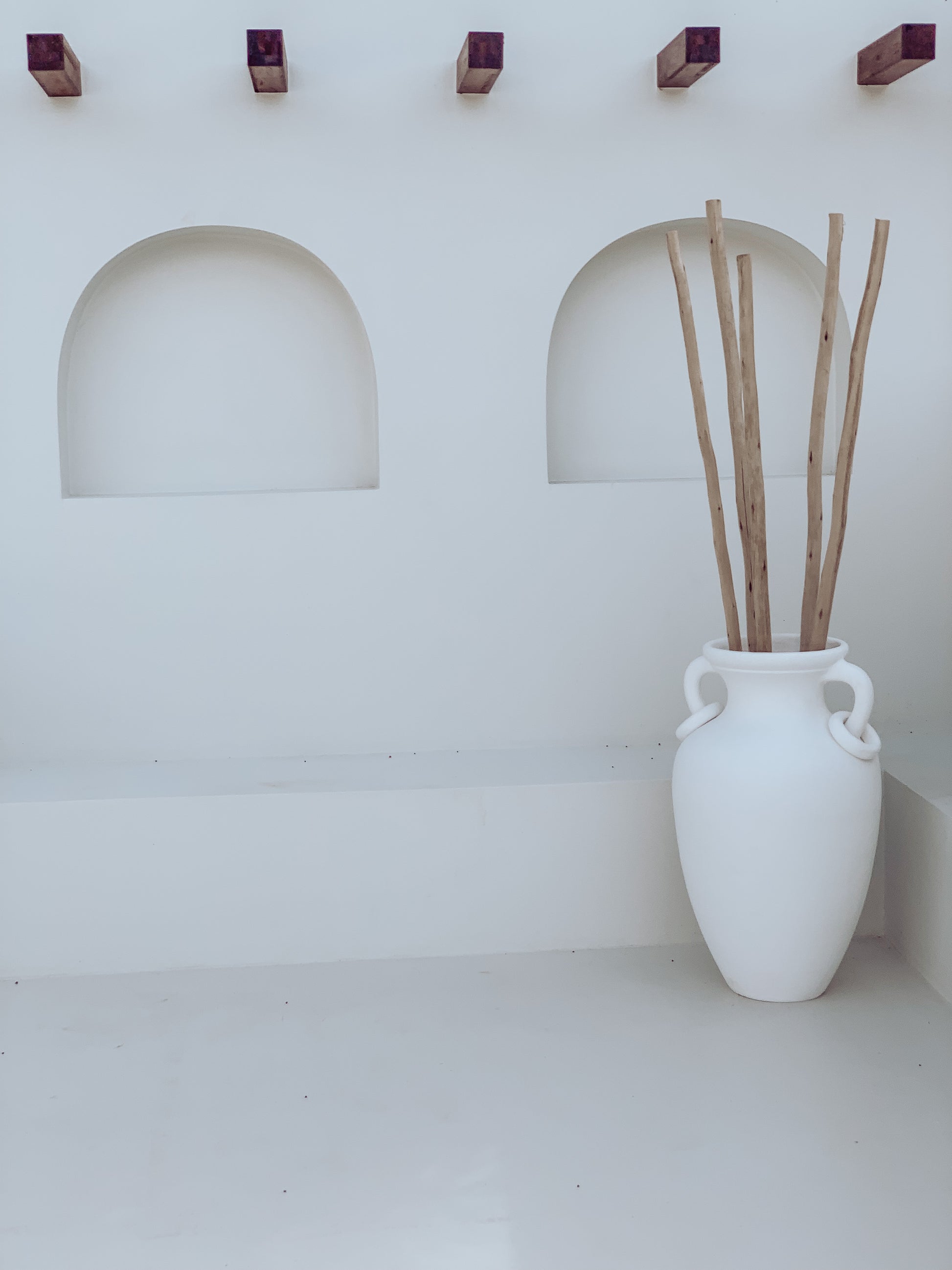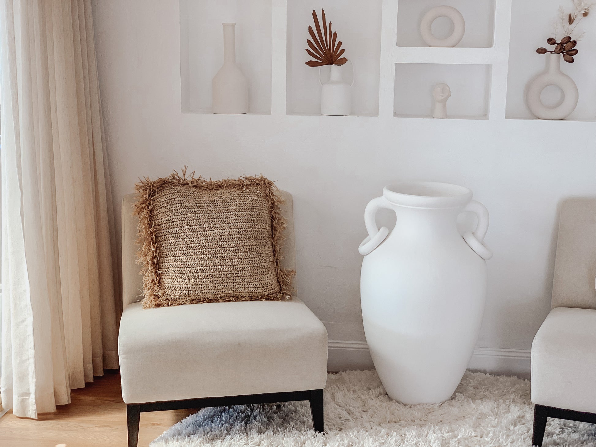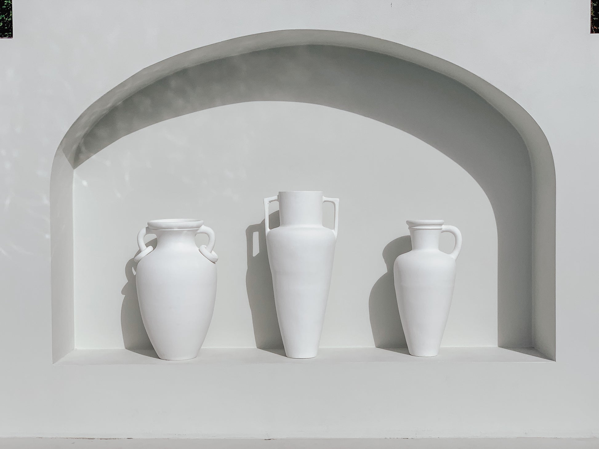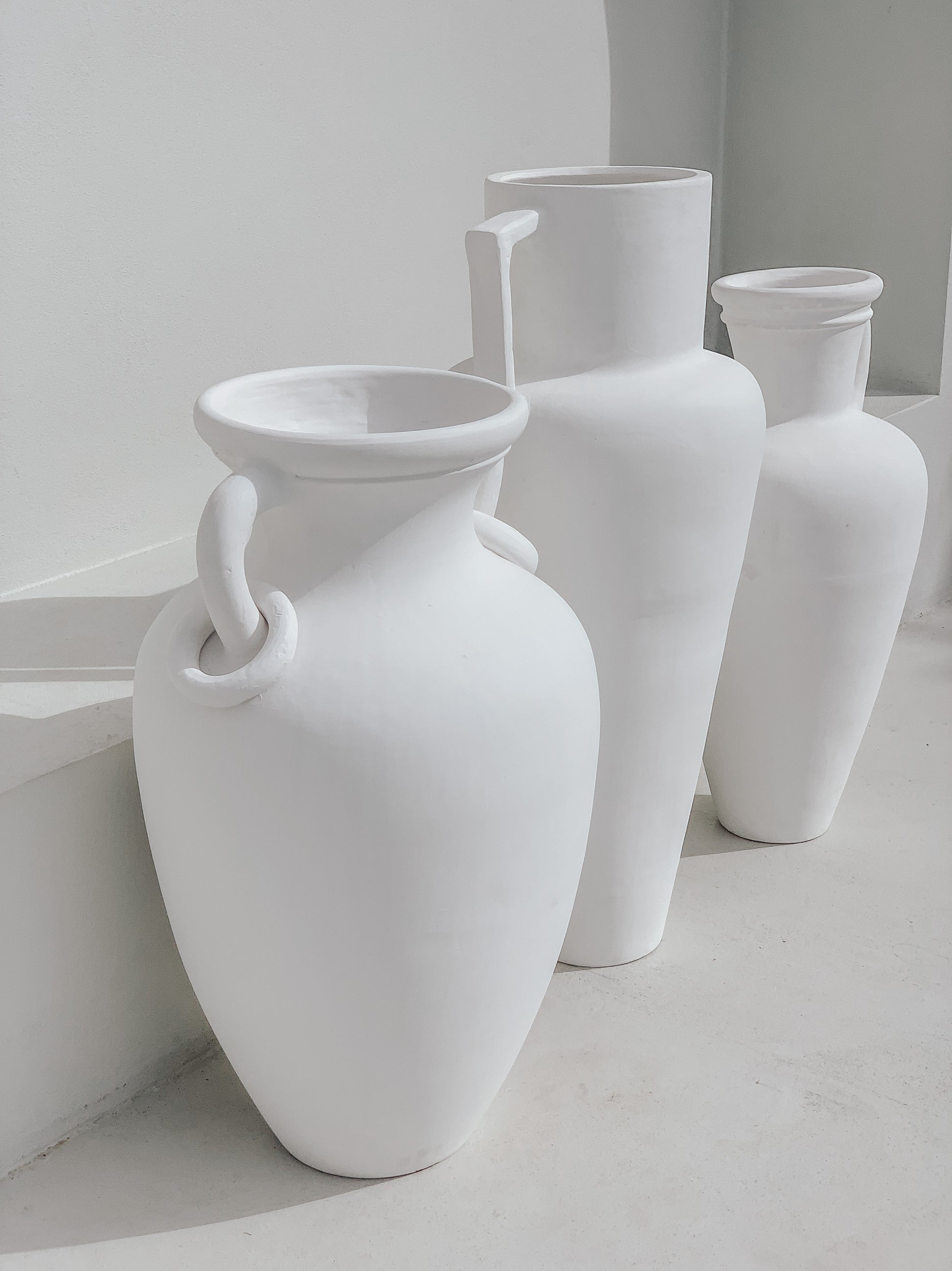 Handcrafted in Vietnam from local clay, the Freya vase features a slim neck that opens into a wide top, curving into a rounded body and tapering to a flat base. Two elegant curved handles, each with a ring, complete the striking design. Finished in a smooth matte white, this vase is both functional and decorative.